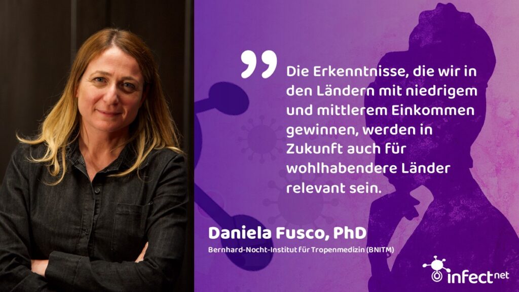 Dr Daniela Fusco leitet eine Arbeitsgruppe in der Abteilung für Infektionsepidemiologie am Bernhard-Nocht-Institut für Tropenmedizin (BNITM) in Hamburg. Im Infect-Net-Kurzinterview erzählt sie uns mehr darüber, wie ihre internationale Forschungsarbeit die Welt ein bisschen besser macht.