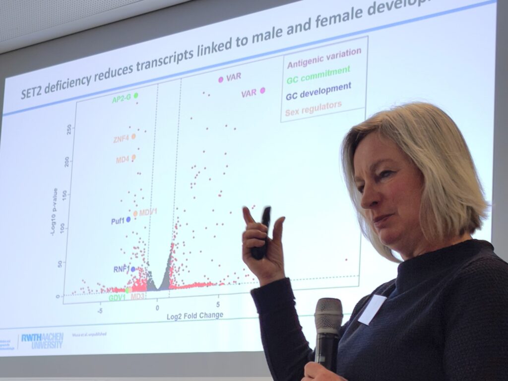 Parasitologist Prof Dr Gabriele Pradel von der RWTH Aachen University widmete sich in ihrem Vortrag der Malariaforschung. Sie erklärte die molekularen Mechanismen bei der Bildung der Geschlechtsstadien des Malaria-Erregers – ein entscheidender Prozess für die Verbreitung der Krankheit – und gab einen aktuellen Überblick über die neuesten Entwicklungen in der Malaria-Impfstoffforschung.