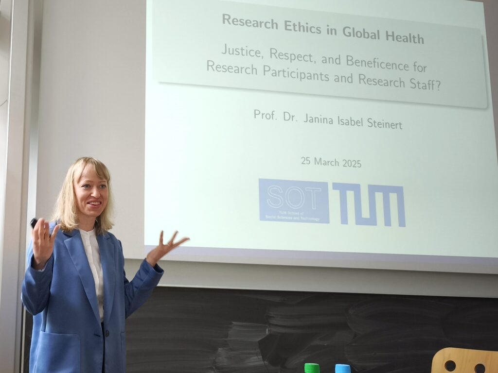 Prof Dr Janina Steinert, TUM-Professorin für Global Health, stellte in ihrem Vortrag die ethischen Herausforderungen in der Global Health Forschung und mögliche Lösungsansätze zur Diskussion. Sie kritisierte die häufig unzureichende Berücksichtigung sozialer und kultureller Bedürfnisse sowohl der Datensammler als auch der Probanden in Global Health-Studien. Dies beeinträchtige nicht nur die Datenqualität, sondern könne auch negative Auswirkungen auf die beteiligten Personen haben. Prof. Steinert zeigte auf, wie wichtig eine ethisch vertretbare und respektvolle Datenerhebung ist, die den Kontext und die Perspektiven der Betroffenen einbezieht.