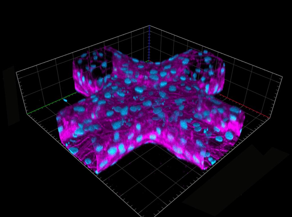 Kreuzung von 3D-perfundierbaren Mikrogefäßen aus primären menschlichen Gehirn-Endothelzellen. Der Verbindungsmarker VE-Cadherin (magenta) zeigt die dichten Zell-Zell-Kontakte innerhalb des Kollagen-Hydrogels (schwarz).
